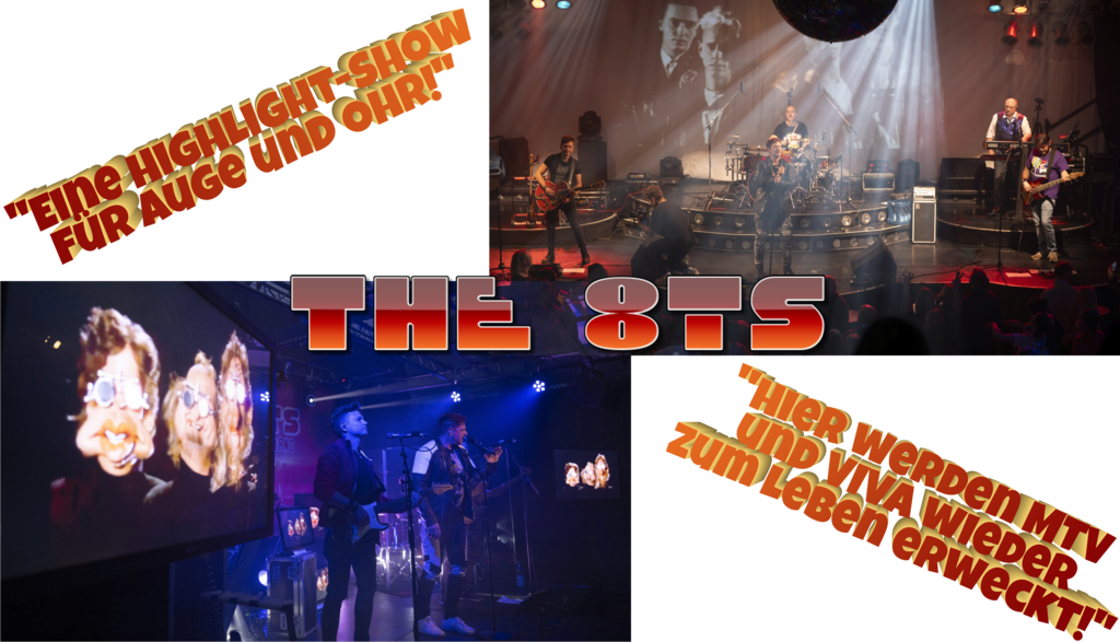 The 8Ts bieten eine aufwendige Live-Show mit den größten Hits der 80er Jahre. Dabei werden die Songs aber nicht nur in Top-Qualität originalgetreu live wiedergegeben … zusätzlich laufen die Original-Videos der 80er-Hits synchron zum live gespielten Song auf Monitoren oder LED-Wänden (je nach Bühnengröße) mit.